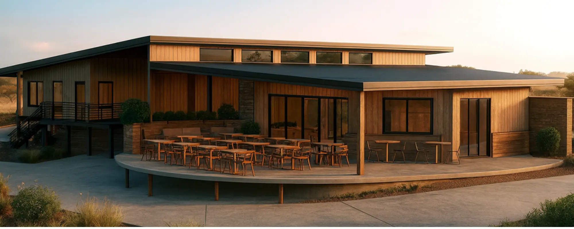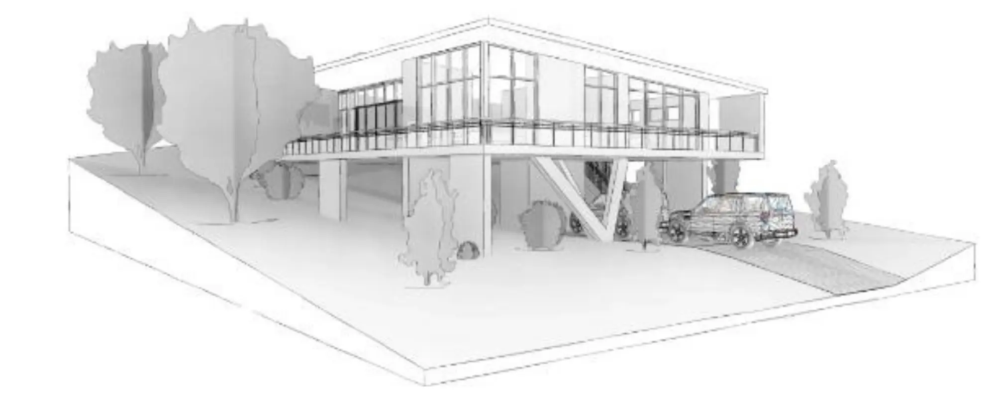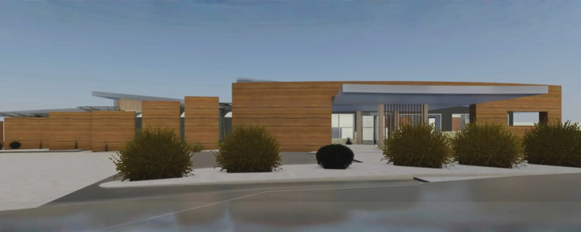 Reception concept render – Front view with earth rammed walls