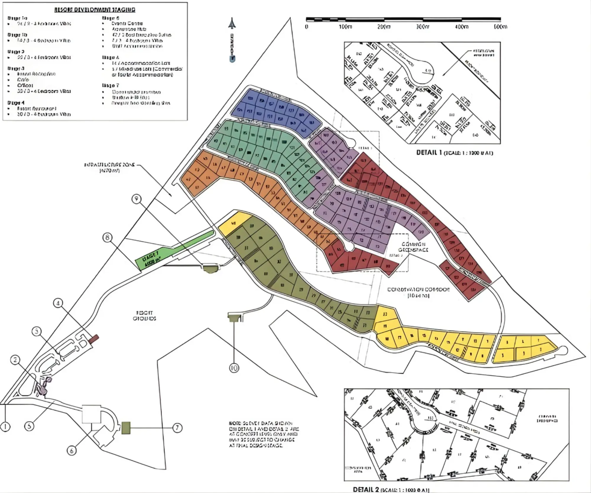 Indicative staging diagram illustrating the six-phase rollout of the Vuez Resort masterplan. The colour-coded clusters demonstrate how development progresses sequentially across the site, with accommodation lots introduced in defined sections while maintaining access to shared infrastructure and the central resort precinct.